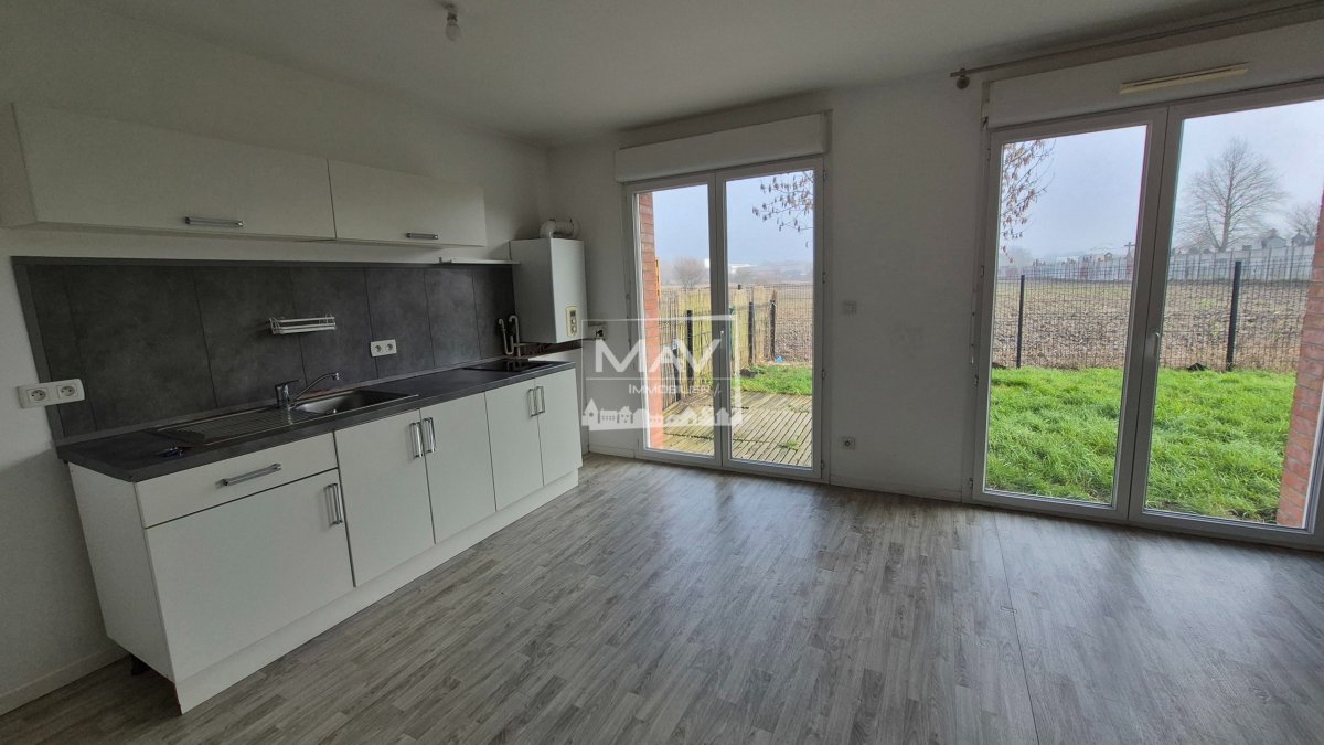 A VENDRE - NEUVILLE EN FERRAIN, résidence Vert Galant - Dans résidence récente et sécurisée, au rez de chaussée, appartement 2 pièces de 45m² offrant un salon-séjour de 28 m² avec cuisine aménagée et équipée (plaque), une chambre de 11m² avec placard, une salle de bains avec baignoire et WC. Jardin privatif clôturé. Une place de parking. Chauffage gaz individuel - menuiseries double vitrage avec persiennes. A deux pas des commerces, écoles et du centre commercial Promenade de Flandres ! Charges de copriété : 350€ / trimestre - Taxe foncière : 700€