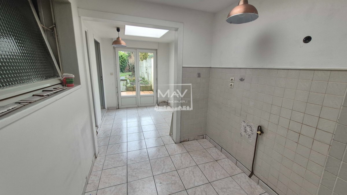 A VENDRE - HALLUIN, CENTRE VILLE - Maison d'environ 100 m² offrant sur une entrée, un grand séjour de 32 m², une cuisine séparée, une buanderie et la salle de bain et un wc. Aux étages, trois chambres de 8m², 8m² et 11.28 m² + un bureau. Un jardin clôs de 115m² avec un accès à 2 garages fermés tout en étant sur une zone constructible ( possibilité entrepôt ou revenus locatifs d'environ 1300€/annuel ). Chauffage individuel GAZ / Menuiseries double vitrage avec volets roulants au rez-de chaussée. Taxe foncière : 506€. Située dans un quartier calme, à deux pas des écoles ( Ecole Sainte Marie, Collège Robert Schuman ...), commerces et transport ( Bus 82 )