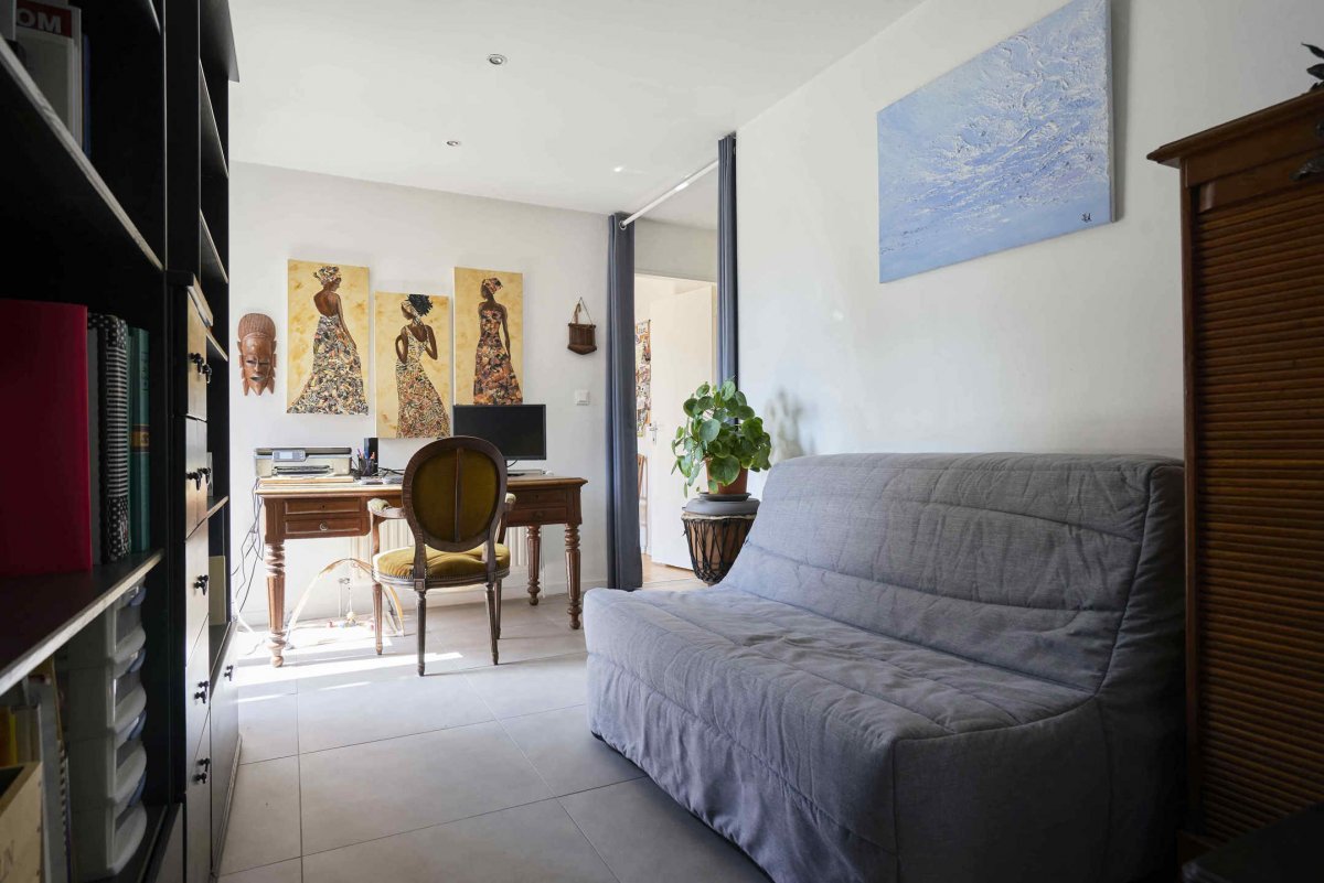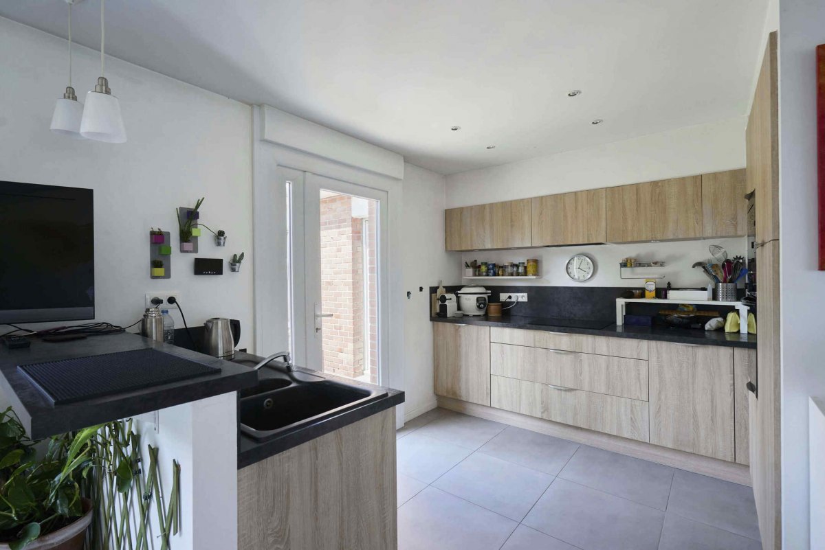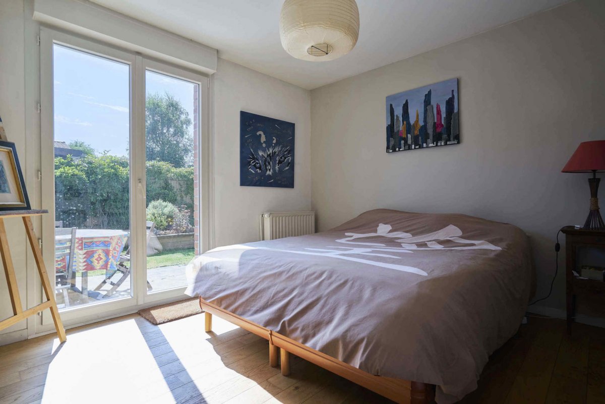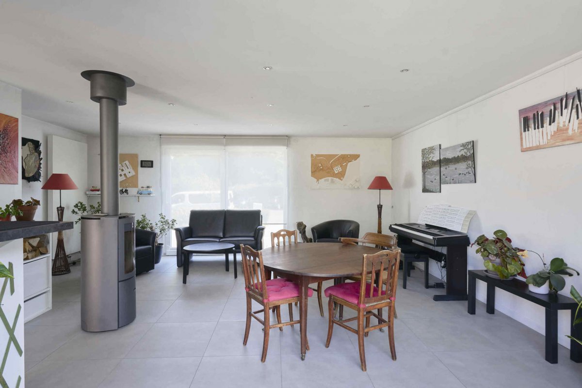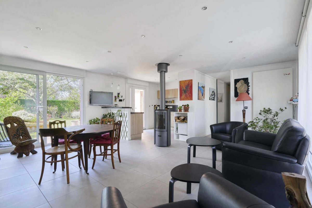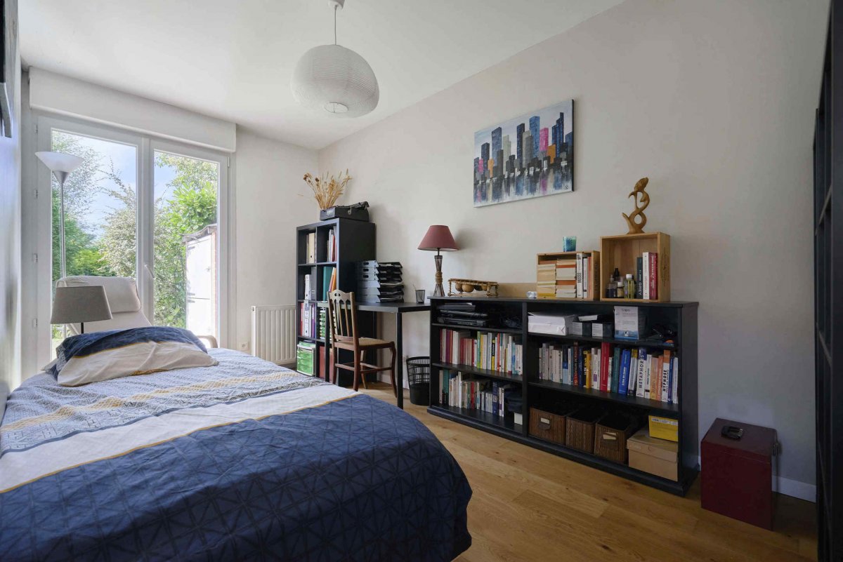 En fond de raquette, jolie maison mitoyenne de plain-pied, offrant un hall d'entrée avec vestiaire, un séjour lumineux, traversant, et avec poêle à bois, une cuisinée équipée et ouverte sur le séjour, une pièce faisant office de bureau (possibilité chambre), deux belles chambres dont une avec placards, un dressing et une salle de bains complète (douche + baignoire). Également, une buanderie, un double garage et parking 3/4 voitures. Jardin ensoleillé d'environ 300m², sans vis à vis, arboré et paysagé. Maison entièrement rénovée (double vitrage, volets motorisés, chaudière neuve, électricité refaite…), le tout à proximité immédiate du centre et des commerces, et à 15min à pied du Tramway.